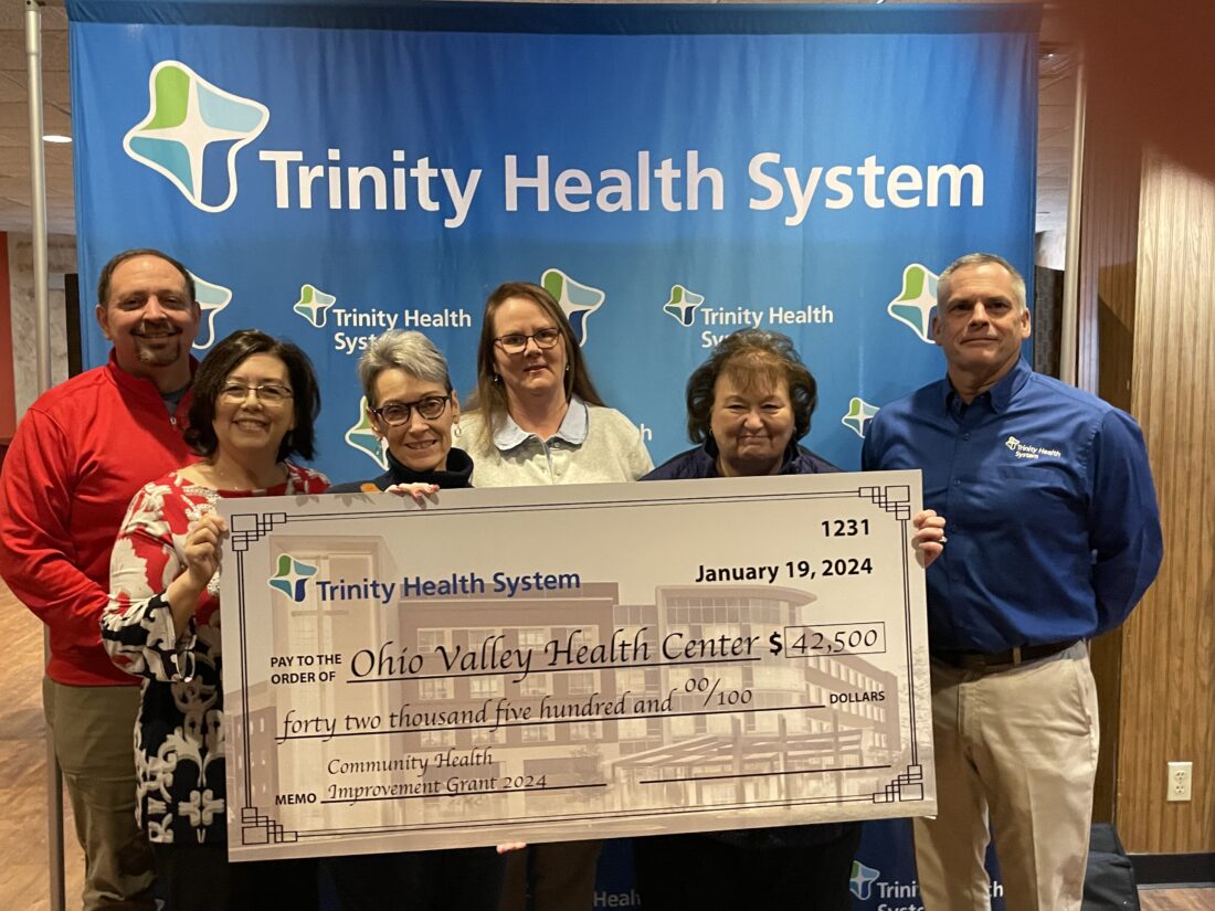 - RECEIVES MONEY — Representatives from the Ohio Valley Health Center who were on hand for Friday’s presentation were, from left, Matt Grimshaw, Trinity’s president and CEO; Diann Schmitt, volunteer nurse practitioner at the health center; Ann Quillen, executive director of the health center; Denise Lucas, volunteer nurse practitioner of the health center; Janet Bischof, volunteer nurse practitioner of the health center; and Dave Werkin, Trinity’s vice president of finance. — Julie Stenger