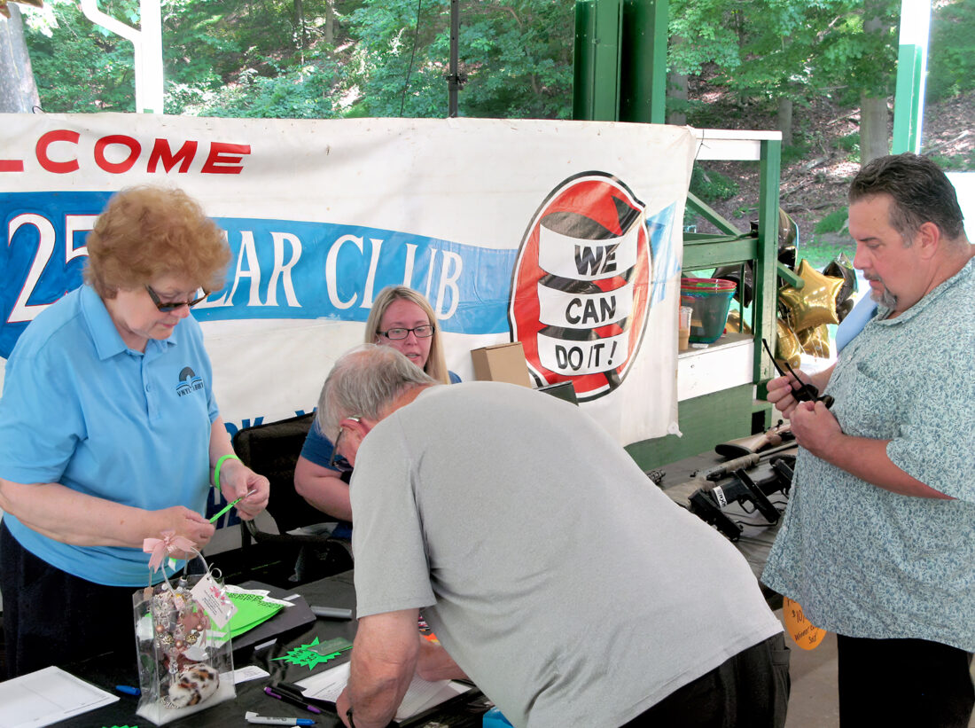 FOOD AND FELLOWSHIP — Volunteers Misty Cowden, standing, and Tina Greer assisted Danny Staley, James Castellucci and others in participating in a Chinese auction or gun drawing held during the Weirton Steel 25-Year Club’s picnic to raise money for next year’s event. Held Saturday at the Serbian Picnic Grounds, the event drew hundreds of former Weirton Steel employees. -- Warren Scott
