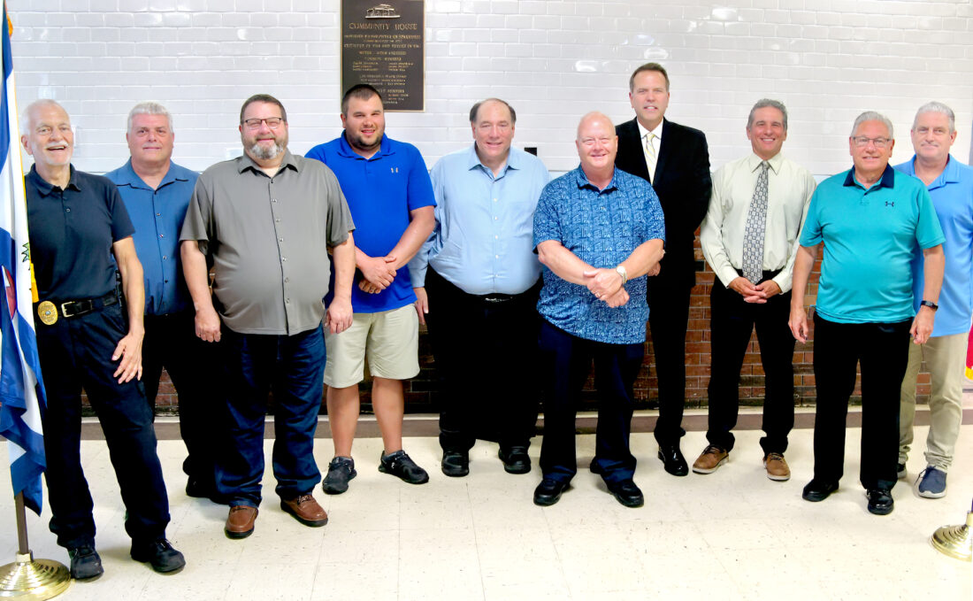 Newly elected and re-elected leaders of Follansbee were looking to the future after being administered oaths of office by 1st Judicial Circuit Court Judge Jason Cuomo on Tuesday at the Follansbee Community House. Participating in the ceremony were, from left, Police Chief Larry Rea, 1st Ward Councilman Anthony D’Ulisse, 2nd Ward Councilman John Casinelli, 5th Ward Councilman Joe Kafton, City Attorney Michael Gaudio, Councilman at large John Schwertfeger, Mayor Scott McMahon, 3rd Ward Councilman Nick Cekinovich, 4th Ward Councilman Rudy Cipriani and City Clerk David Kurcina. In addressing the guests on hand, McMahon predicted city officials will have hard decisions to make in the future and will disagree at times, but he encouraged them to always treat each other with respect because all want to make the city better. — Warren Scott