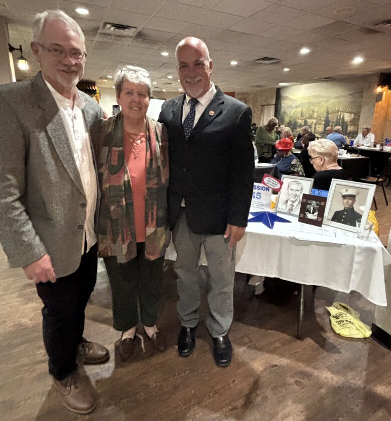NIGHT OF HONORS — The Jefferson County Democratic Party Oct. 11 held a Night at Races in memory of the late Jerry Krupinski. Joining his wife, Eileen Krupinski, were his son, Scott Krupinski, left, and party Chairman Eddie Abdalla. -- Contributed