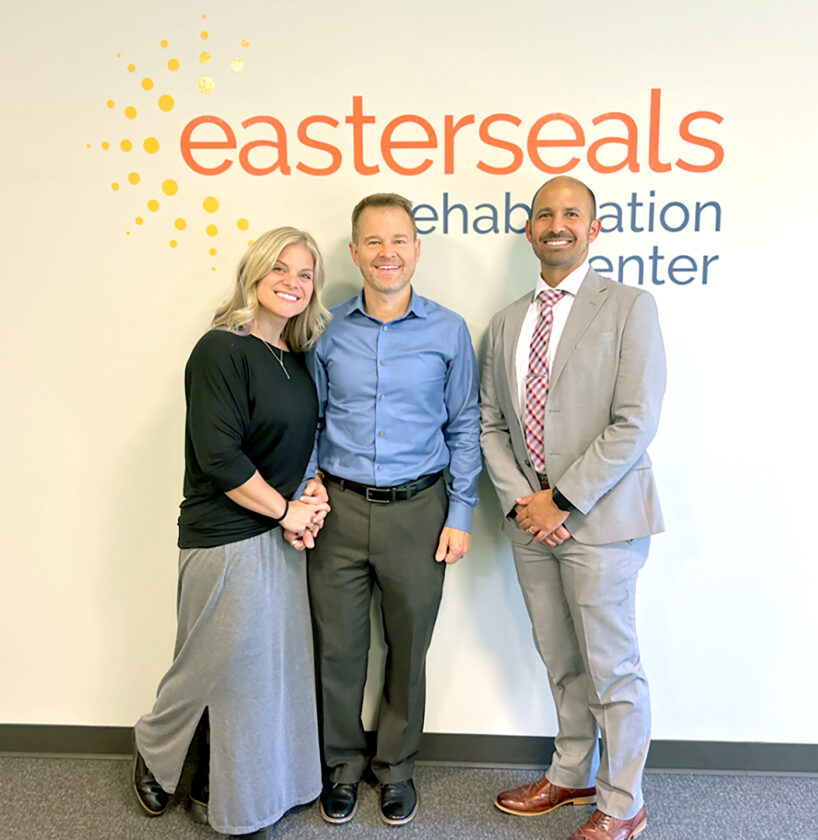 DIRECTOR — Amanda Mossman and Dr. David Mossman, center, the new medical director for the Easterseals Rehabilitation Center in Wheeling, are welcomed to the organization by Eric Filberto, president and CEO of the center. -- Contributed