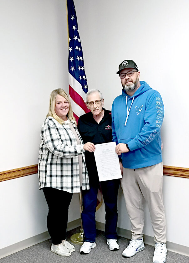 SERVICE REMEMBERED — Toronto Council Monday adopted a resolution honoring the late Janet Clore, a longtime clerk with the city who died on Sept. 20. Council President Frank McEwen, center, presented a copy of the resolution to Clore’s daughter, Amy McLaren, and son, Matt. -- Contributed