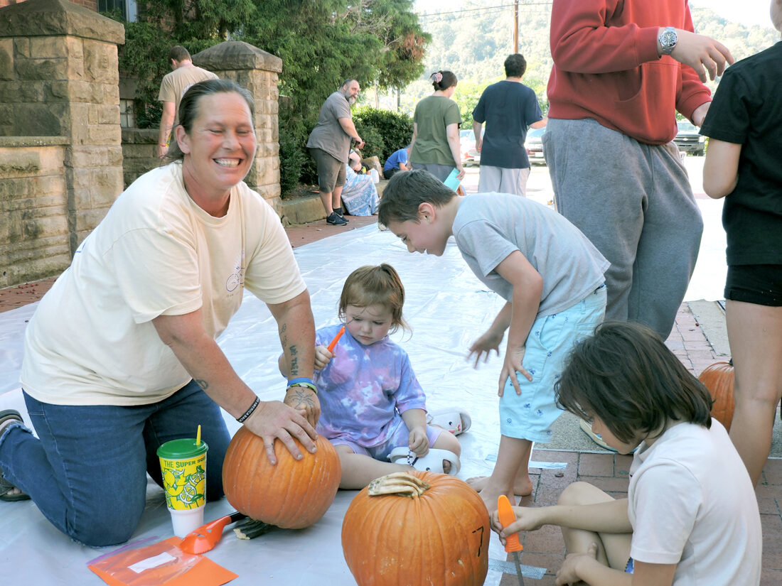 - WORKING TOGETHER — From left, Lisa Merigo of Follansbee assisted 2-year-old Eva Dofka with a jack o’lantern while five-year-old A.J. Beard offered suggestions and eight-year-old Myah Beard labored on her own during the pumpkin-carving contest held during the Wellsburg Applefest Saturday. — Warren Scott