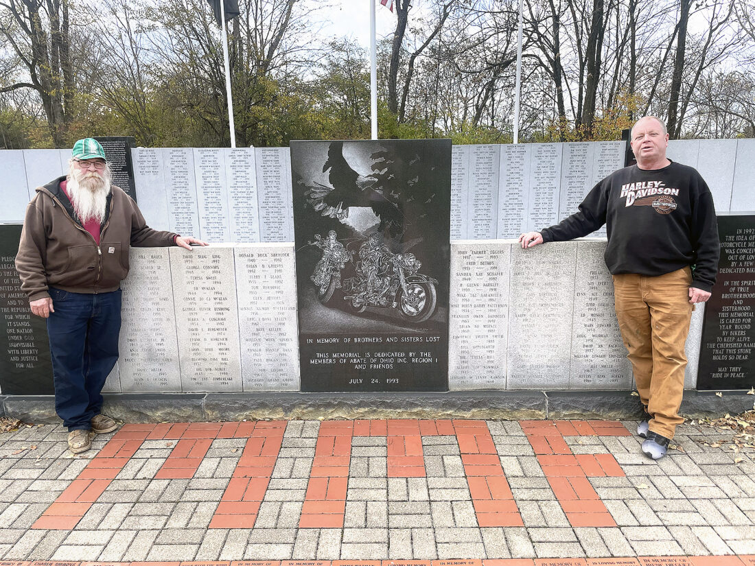 - A PLACE OF MEANING — Rodney Wedlake, left, and Jay Ruttencutter are board members of the Motorcyclist Memorial Foundation. Founded in July 1993, the memorial wall holds the names of dedicated motorcyclists who have died or names of those who believe in what bikers stand for. Wedlake noted he has family members listed on the wall, including his mother and father, a brother and his in-laws. He can immediately pinpoint the location of their names on the opposite side of where he stands. The wall is especially meaningful to him, as he ensures its upkeep by visiting the site at least three times a week. — Julie Stenger