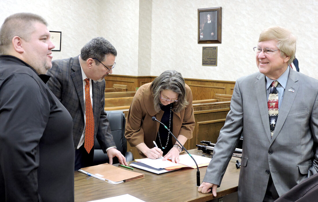 SIGNING IT OVER — Chester Mayor Ed Wedgewood, at left, talks with County Commissioner Paul Cowey, at right, during Monday’s county commission meeting, while Commission President Eron Chek signs the memorandum of understanding for operations of Chester’s municipal elections as County Administrator John Klee looks on. -- Craig Howell