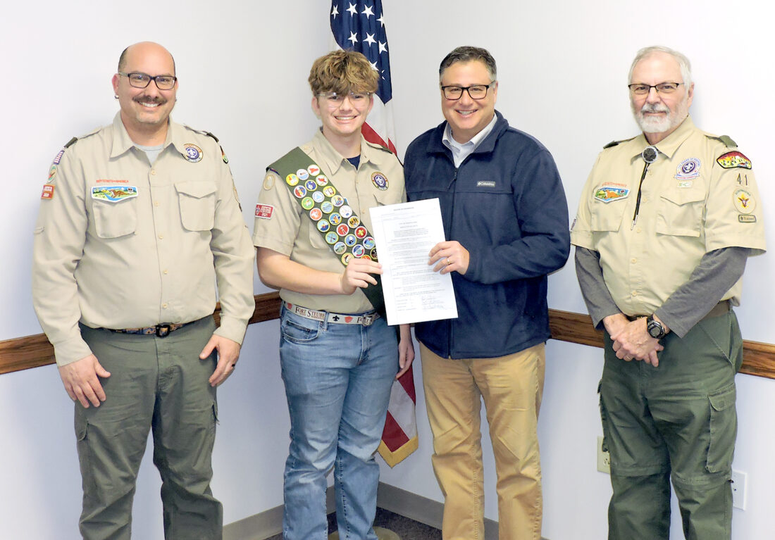 SPECIAL RECOGNITION — Among many local youth recognized by Toronto Council on Monday was Pax Joseph Frey of Boy Scout Troop 41, who, for his Eagle Scout project, oversaw the design and construction of a gaga ball court behind Toronto Junior-Senior High School. On hand for the presentation of a resolution in Frey’s honor were, from left: Eric Frey, his father and a Scout leader; Frey, Mayor John Parker and Gary Hawkins, Scoutmaster for Troop 41. -- Warren Scott