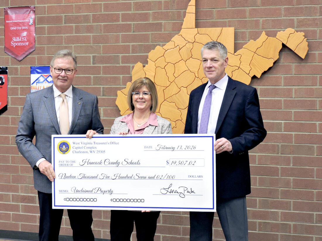 NEW CUMBERLAND — West Virginia Treasurer Larry Pack was in the Northern Panhandle Friday, returning a portion of the state’s estimated $500 million in unclaimed property dollars to area businesses and governmental entities.
