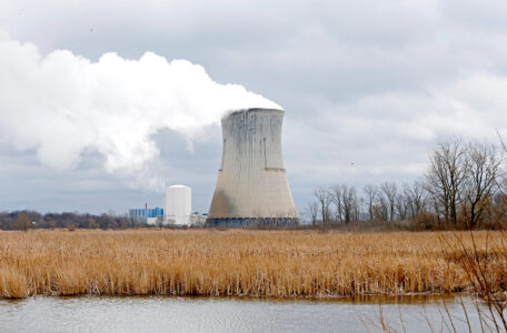 FILE – Plumes of steam drift from the cooling tower of FirstEnergy Corp.'s Davis-Besse Nuclear Power Station in Oak Harbor, Ohio, April 4, 2017. (AP Photo/Ron Schwane, File)
