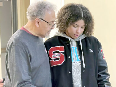 HONORED — Talea Guntrum, a three-time state wrestling champion, received recognition from Bill Hendricks, president of the Steubenville Board of Education, during Wednesday’s meeting. -- Ross Gallabrese