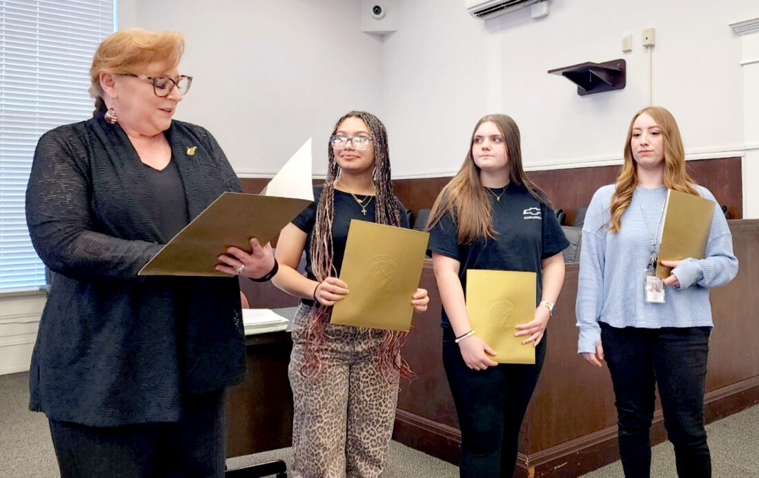 PROMOTING VOTING — At a recent Brooke County Commission meeting, Dale Butler, the county’s elections clerk, introduced the three local winners of the I Voted sticker contest in which students throughout the state were invited to design a sticker to be given to voters in this year’s elections. With Butler are, from left: Aisha Swango, who placed first; Raelyn Zankel, who placed second; and Ava Conley, who placed third. -- Contributed