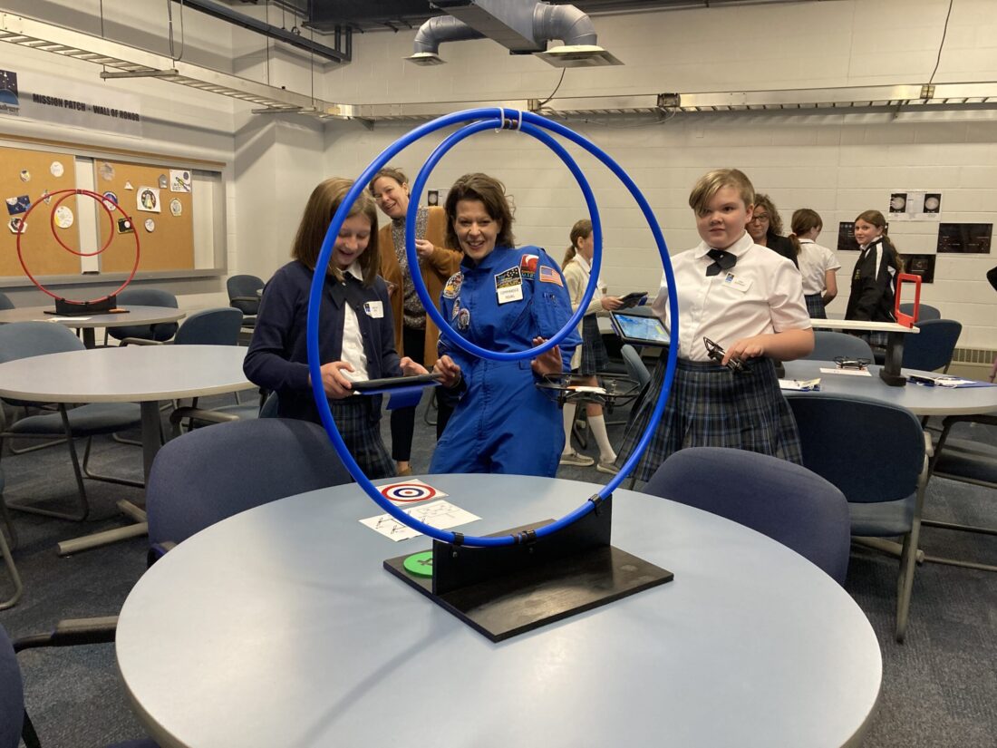 File photo In this 2023 photo, Braelyn Beiter, left, a student at Corpus Christi School in Warwood, learns to maneuver a drone at the Challenger Learning Center at Wheeling University. Assisting her are Commander Michele Young and fellow student Ava DePriest.