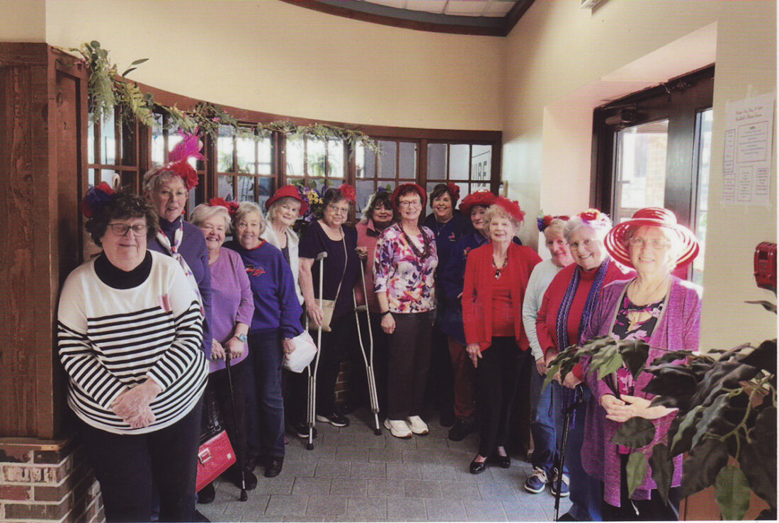 The Weirton Red Hat Sassie Lassies met at Froehlich’s Classic Corner in Steubenville. Among those attending were, from left, Donna Robinson, Cheryl Kondik, Karen Kuhn, Connie Norwood, Martha Varitek, Margie Lemasters, Brenda Edwards, Barbara Coburn, Angela Reinard, Queen Ruth Dalesandre, Diane Pastoric, Judith Mikula, Margie Phillips and Carla Colson.