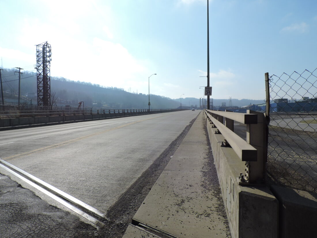 According to WVDOH documentation, the Weirton Steel Overpass Bridge was built in 1966 and rehabilitated in 1998. It consists of 20 simple steel wide-flange beam spans with an overall length of 1,428 feet. The deck width is 60 feet 4 inches. The substructure consists of concrete abutments and piers. The bridge is structurally deficient.