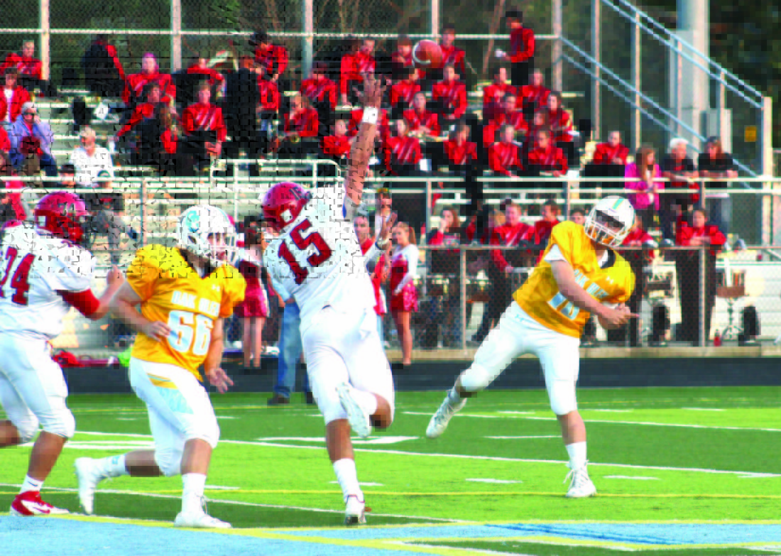 THROUGH A TIGHT WINDOW — Oak Glen’s Nick Chaney completes a pass over Weir’s Tyler Komorowski while Ty Biela (66) looks to block on Aug. 25 (photo by Joe Catullo).