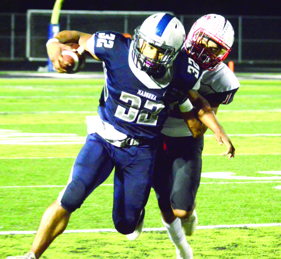 CARRYING THE LOAD — Madonna’s Donavan Kirby rushes against Mathews on Friday. (Photo by Michael D. McElwain)