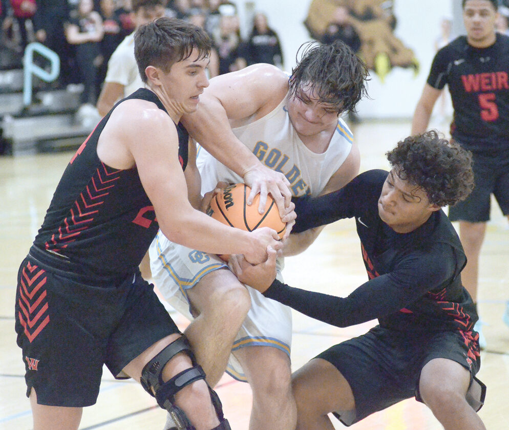 FIERCE BATTLE — Weir High’s Justin Brueck and Damarr Turner try to wrestle a rebound away from Oak Glen’s Alex Dennis during Tuesday’s season opener for both teams inside the Bears Den. - Andrew Grimm