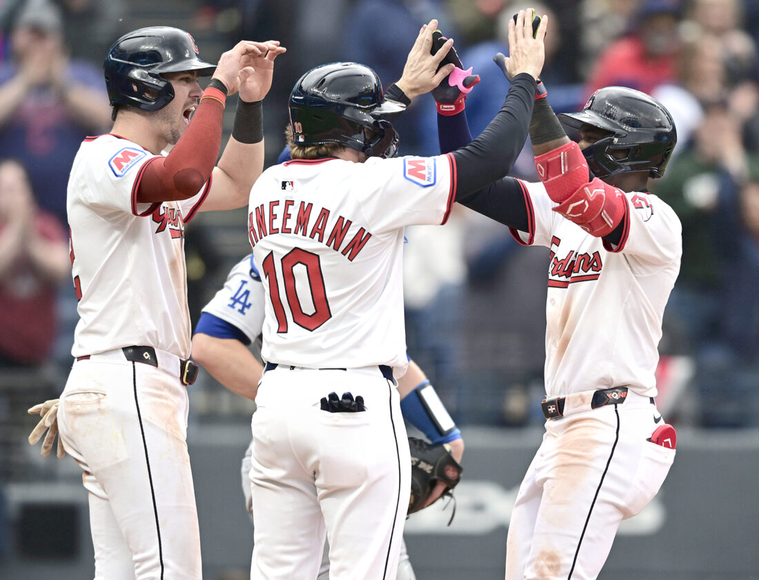 Cleveland Guardians' Angel Martinez, right, is congratulated by Daniel Schneemann (10) and Nolan Jones after hitting a three-run home run off Los Angeles Dodgers relief pitcher Alex Vesia during the eighth inning of a baseball game, Wednesday, May 28, 2025, in Cleveland. (AP Photo/David Dermer)