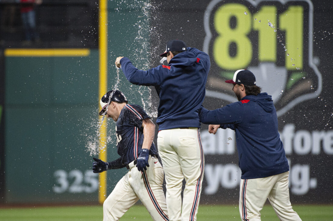 Cleveland Guardians' Kyle Manzardo, left, is doused by teammates after driving in the winning run against the Minnesota Twins at the end of the 10th inning of a baseball game, Friday, Aug. 1, 2025, in Cleveland. (AP Photo/Phil Long)