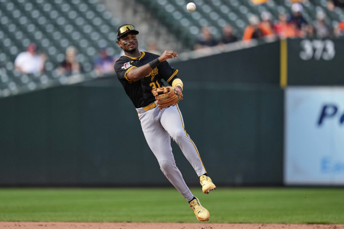 Pittsburgh Pirates shortstop Liover Peguero throws to first base to make an out against Baltimore Orioles' Coby Mayo during the eighth inning of a baseball game, Thursday, Sept. 11, 2025, in Baltimore. (AP Photo/Stephanie Scarbrough)