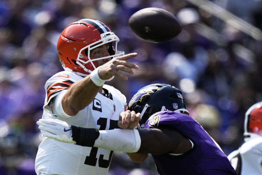 Cleveland Browns quarterback Joe Flacco throws under pressure from Baltimore Ravens linebacker Roquan Smith during the first half of an NFL football game, Sunday, Sept. 14, 2025, in Baltimore. (AP Photo/Stephanie Scarbrough)