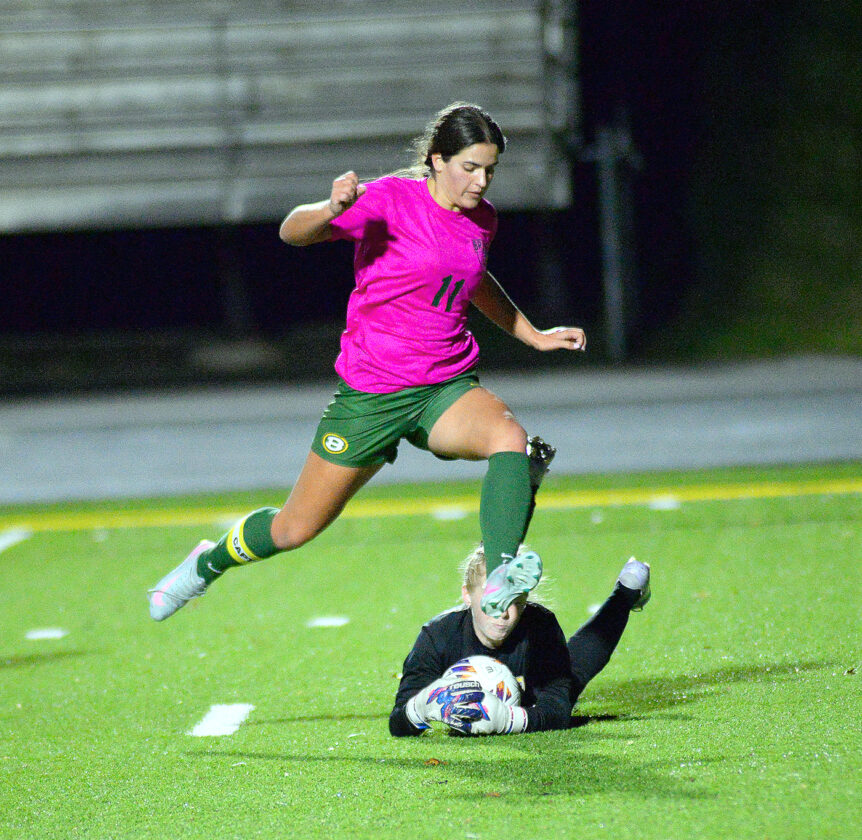 - Brooke’s Adalynne Welsh leaps to avoid Grafton’s goalie after chasing down the ball. – Andrew Grimm
