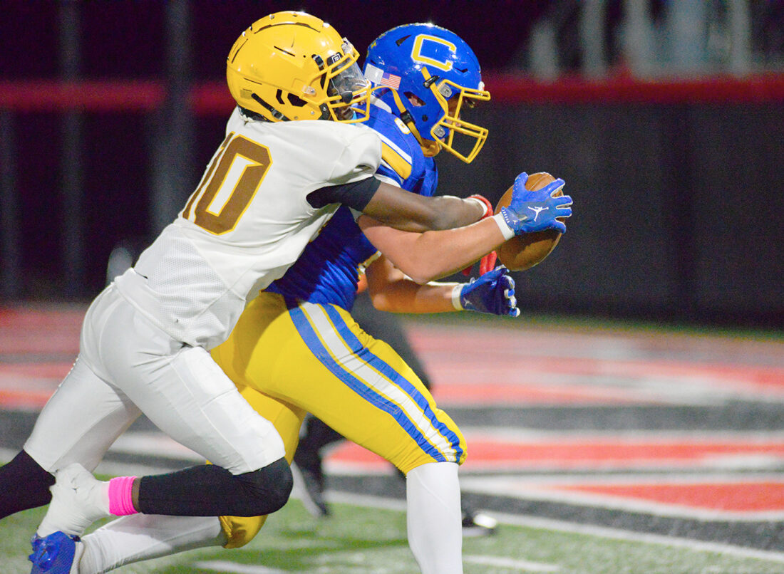 - Catholic Central’s Matty Jones tries to get to the goal line while fighting off a Cleveland East Tech tackler following a catch. – Andrew Grimm