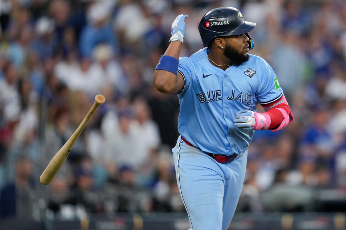 Toronto Blue Jays' Vladimir Guerrero Jr. flips his bat after hitting a two run against the Los Angeles Dodgers during the third inning in Game 4 of baseball's World Series, Tuesday, Oct. 28, 2025, in Los Angeles. (AP Photo/Ashley Landis)