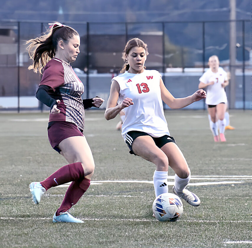 PROTECTING — Weir High’s Kameryn Mallas looks to keep the ball away from Wheeling Central’s Addi Hanson during Tuesday’s Class A/AA Region 1 championship game. - Kim North