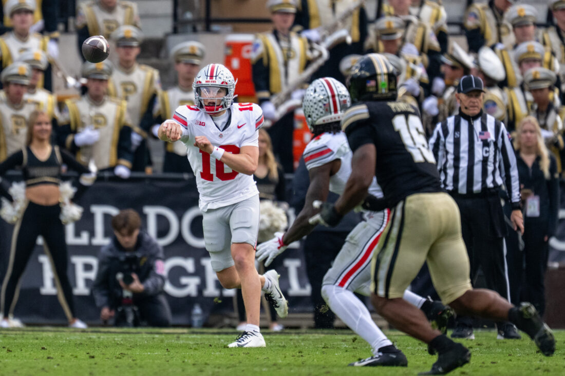 Ohio State quarterback Julian Sayin (10) throws a pass during the second half of an NCAA college football game against Purdue, Saturday, Nov. 8, 2025, in West Lafayette, Ind. (AP Photo/Doug McSchooler)