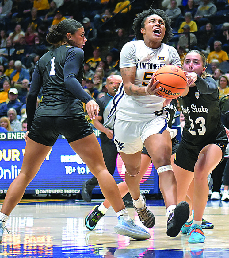 Ron Rittenhouse DRIVING — WVU guard Sydney Shaw (5) drives through Kent State defenders Mya Babbitt (right) and Tatiana Thomas (left) on Friday night.