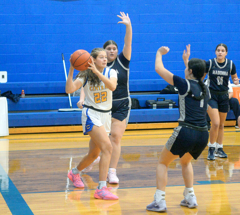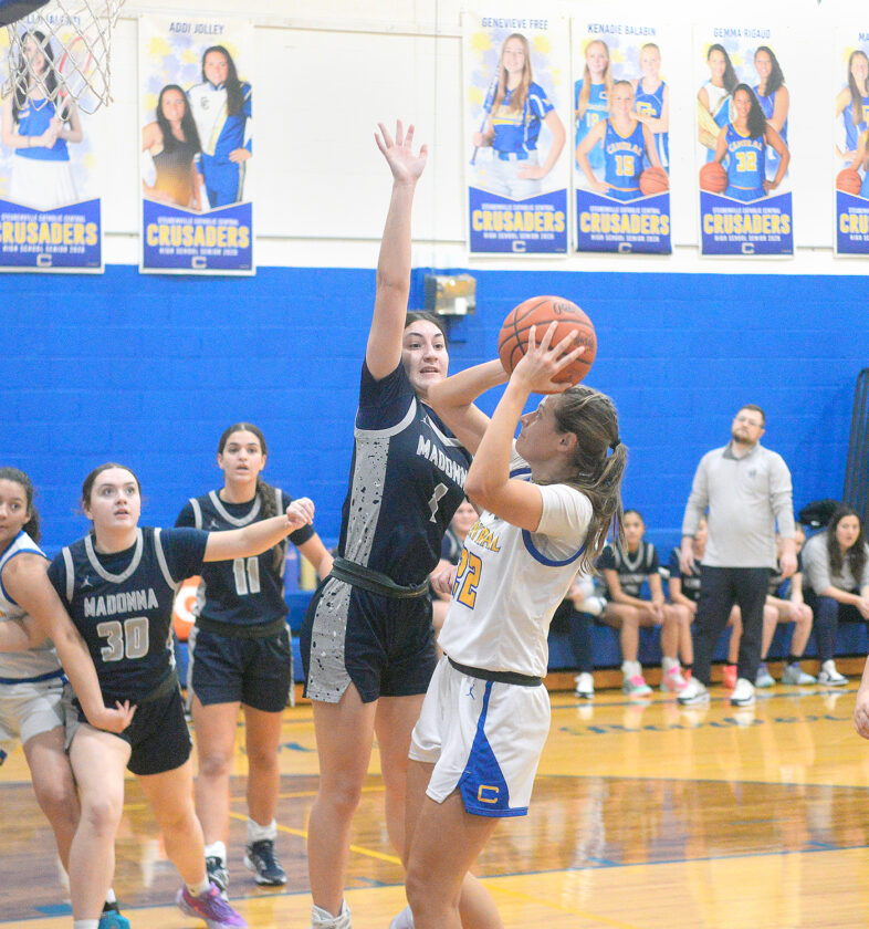 - Central’s Aurelia Hoover puts a layup past Madonna’s Adalynne Welch. – Andrew Grimm