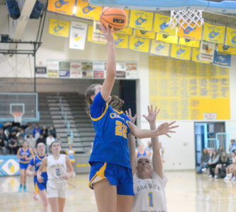 - SHOOTING — Oak Glen’s Keira Vick goes up for a shot past Catholic Central’s Mary Fink during Monday’s game. – Andrew Grimm