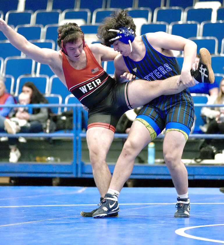 East Liverpool’s Xavier Lara goes for a take down on Weir’s Brodin Baker before getting the win 16-10 at 215 pounds. East Liverpool won Wednesday’s dual match, 52-16. – Jimmy Joe Savage