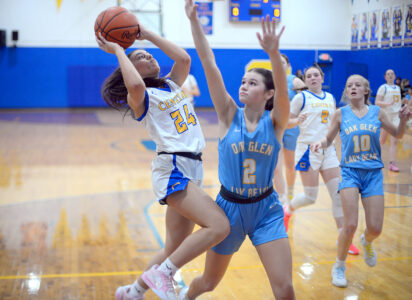 - Oak Glen’s Mikalyn Balch attempts a shot in transition past Catholic Central’s Aurelia Hoover.