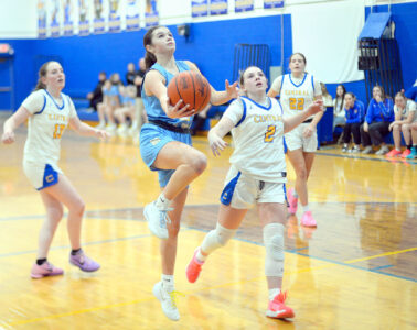 Oak Glen’s Mikalyn Balch attempts a shot in transition past Catholic Central’s Aurelia Hoover.