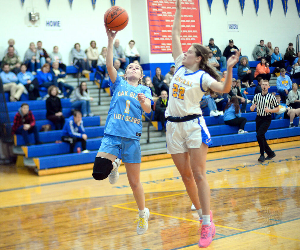 - Oak Glen’s Emma Everett puts up a shot past Central’s Mary Rohde. – Andrew Grimm
