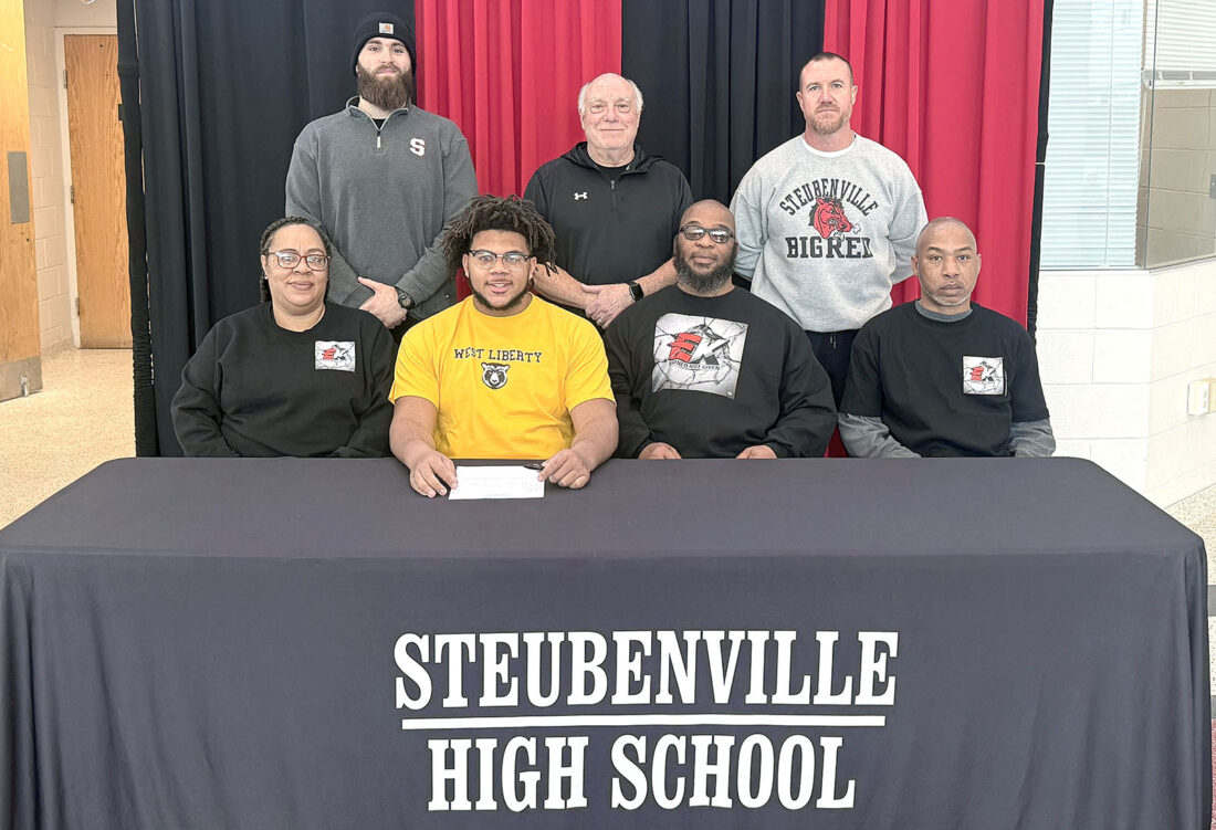Steubenville High School senior Ephy Kelley signed his letter of intent to continue his academic and athletic careers at West Liberty University. Kelley, an All-Ohio offensive linemen for Big Red football, will play on the girdiron for the Hilltoppers while pursuing a degree in business marketing. Joining Ephy, front, center, for the occasion were, seated, his parents Rishauna Harrison and Brett Kelley; and back, Big Red assistant coach Alijah Demitras, head coach Reno Saccoccia and assistant coach Jojo Saccoccia. – Contributed