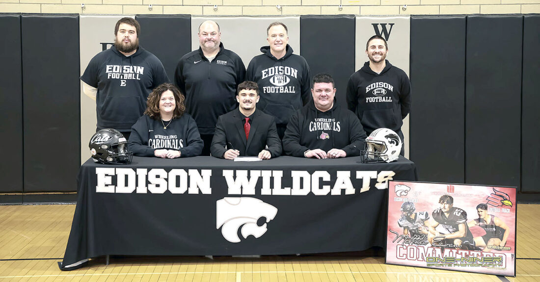 Edison senior Matthew Evans signed his letter of intent to continue his football and track careers at Wheeling University on Friday at Edison High School. Matt ends his football career at Edison High School as a three-year starter and four-year letterman. He accumulated 320 tackles and 11 turnovers as a linebacker. He was twice named first team All Eastern District and first team All OVAC. Matt was Honorable Mention All-Ohio as a junior and third team All-Ohio as a senior. On the track, Matt has been Edison’s leading scorer since his freshman year, specializing in the 110 and 300M hurdles. Last season, Matt was AAAA OVAC Champion and a regional qualifier in both events. Joining Matt, front, center, for the occasion were, seated, his parents Sara and Jamie Evans and, back, from left, coaches Chase Nolan, Jason Fogle, Mike Collopy and Nolan Marcus. – Contributed