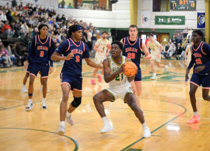 - The Barons’ Karl Yonkeu makes a move to the basket against Hiram. – Andrew Grimm