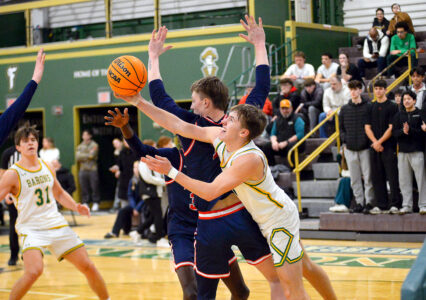 - THROUGH CONTACT — Franciscan University of Steubenville’s Sawyer Butler attempts a shot through contact against Hiram College Saturday. The Barons won on Kuzma Community Day to improve to 15-4. – Andrew Grimm