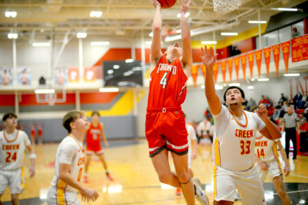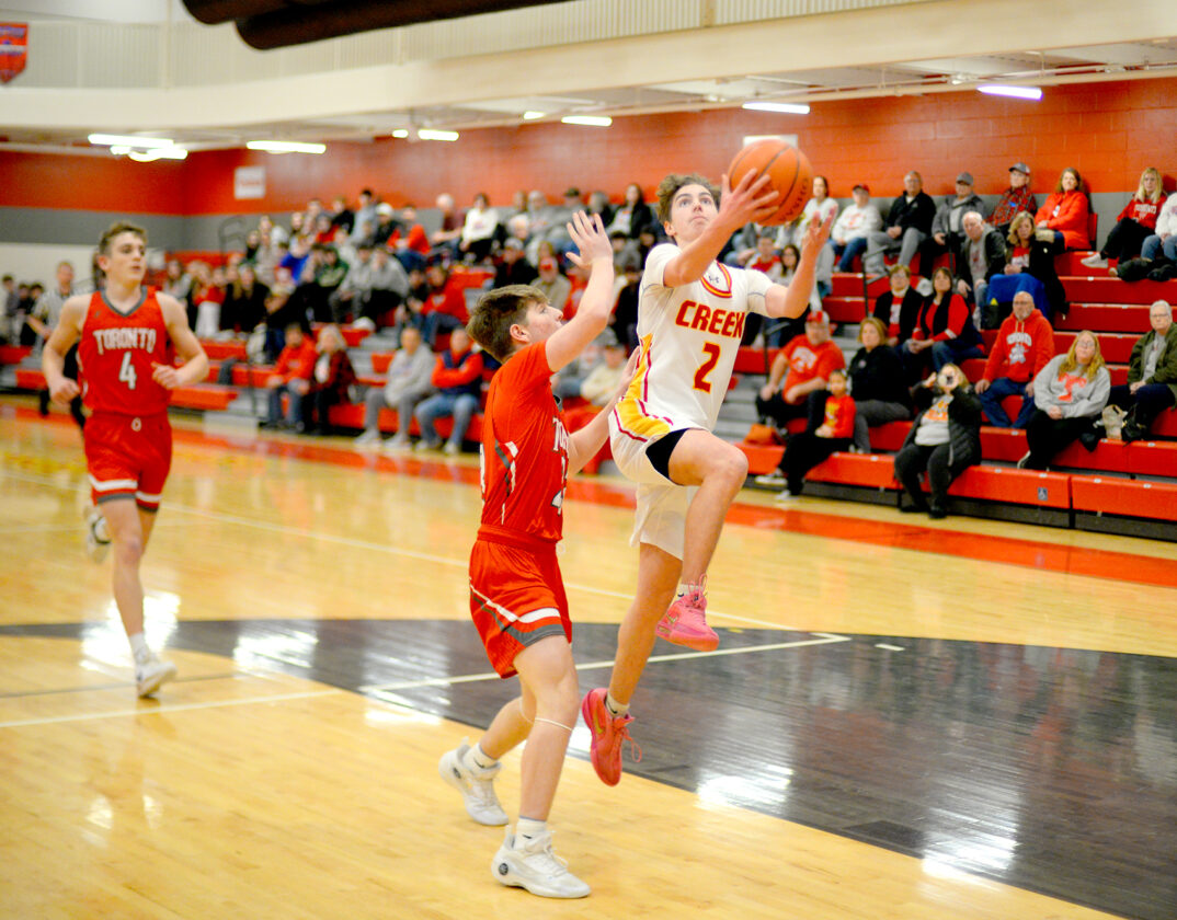 - Toronto’s Max Rebich pulls up to shoot in front of Creek’s Caden Saffle. – Andrew Grimm