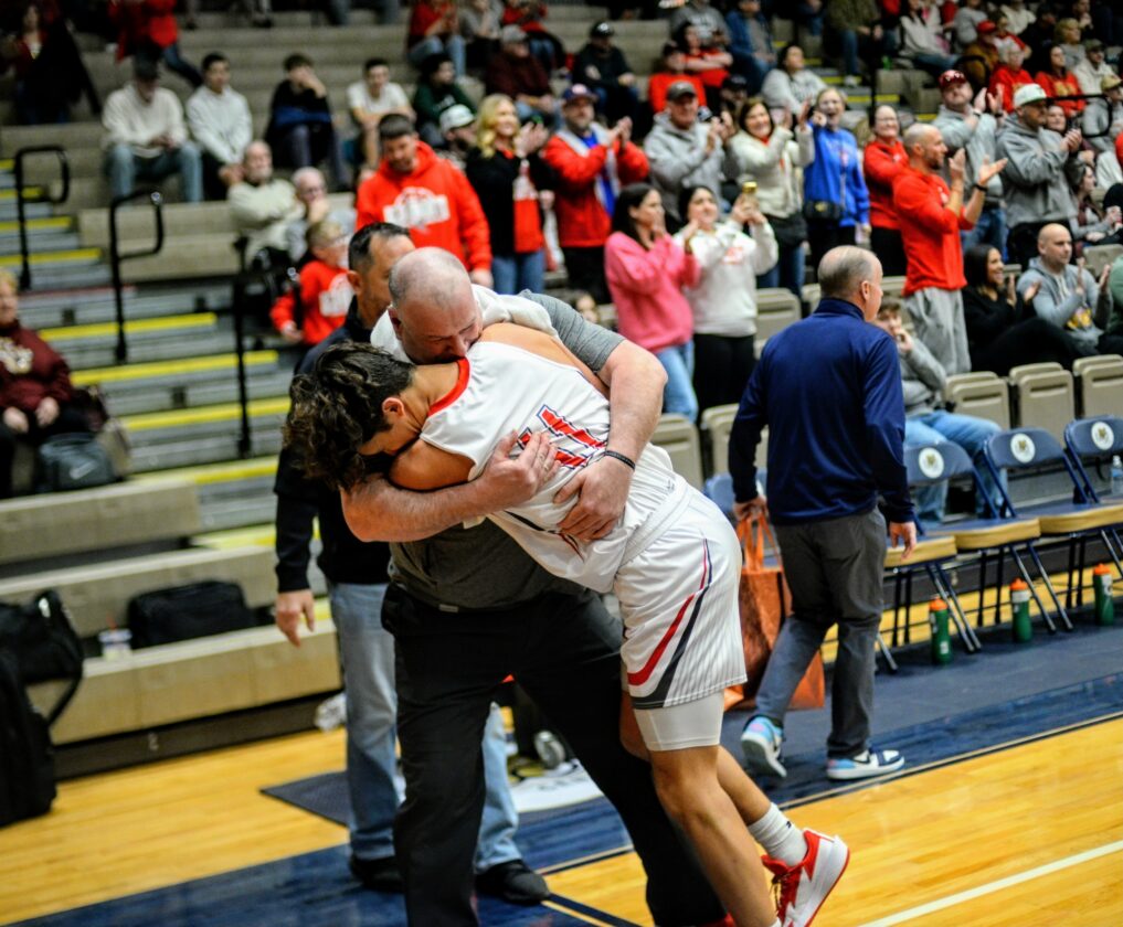 - Toronto’ senior Austin Buchanan embraces coach Sean Tucker after the clock hit zeroes. – Andrew Grimm