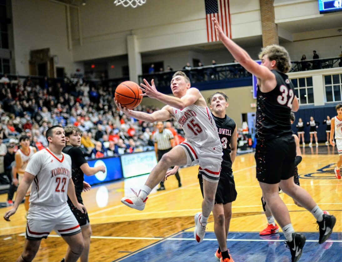 - Toronto’s Brody Winters puts in a layup against Caldwell. – Andrew Grimm