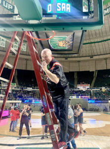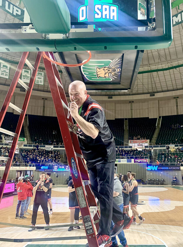 COLLECTING NETS — Big Red head coach Mike Haney brings down the last piece of net during the celebration. - Andrew Grimm