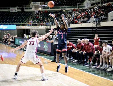 Big Red’s Tre’von Wiggins shoots one of his seen 3-pointers on Saturday. - Andrew Grimm