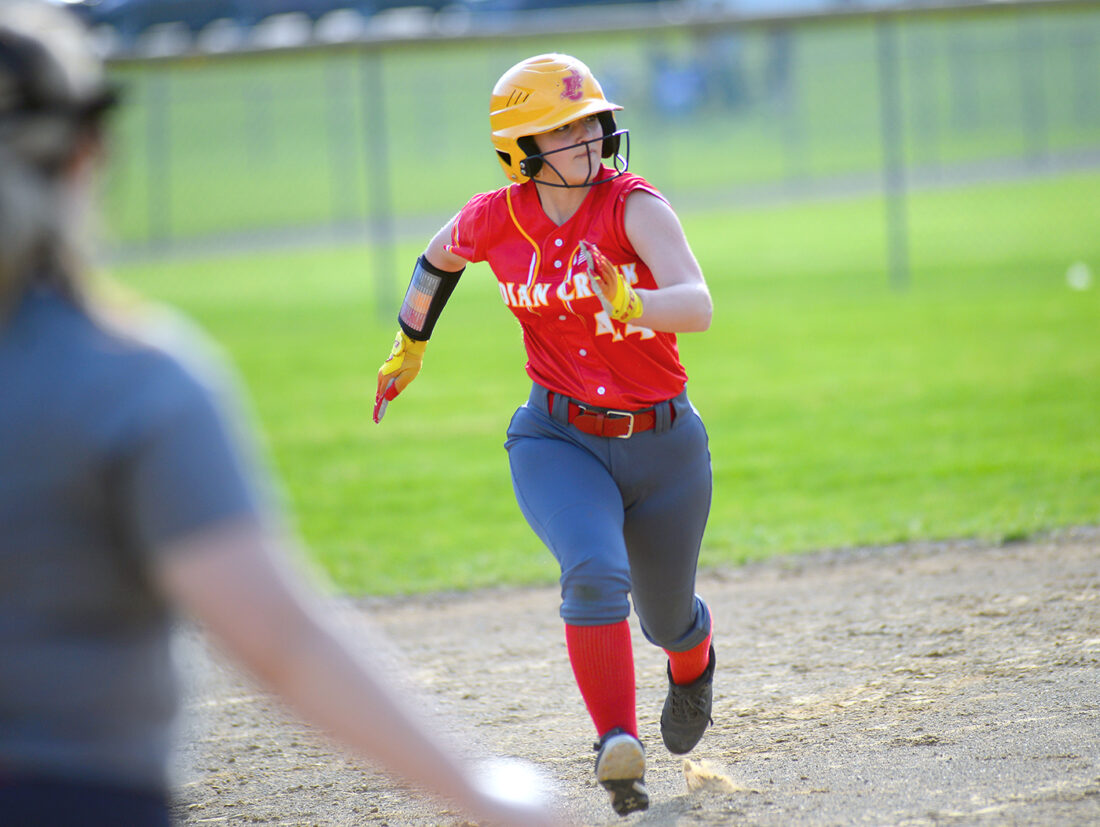- Photo by Andrew Grimm RUNNING HARD — Indian Creek’s Tori Gross runs to third after a teammate put a ball in play Thursday at Buckeye Local. She had two hits in the game.