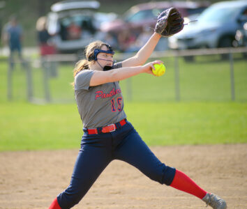 Photo by Andrew Grimm IN THE CIRCLE — Buckeye Local starting pitcher Karlie Lander goes through her throwing motion to deliver a strike against Indian Creek. She struck out seven and did not issue a walk in the game.