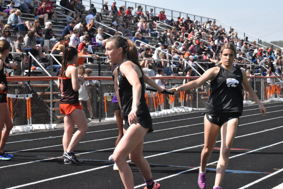 - Kim North EXCHANGE – Edison’s Josie Lesnansky, left, takes baton from Lydia Krepps in the 4×800 relay.