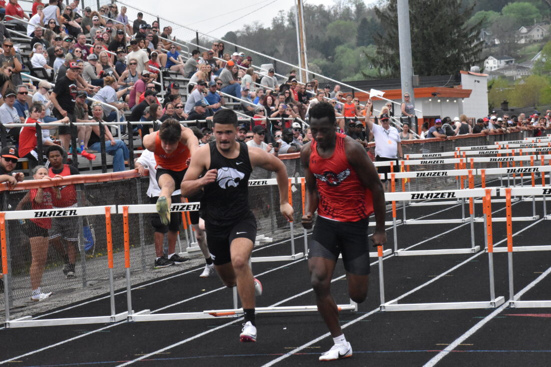 Kim North TO THE LINE - Big Red's JoJo Rea and Edison's Matt Evans race to the line of the 110 hurdles during the Shadyside Relays.