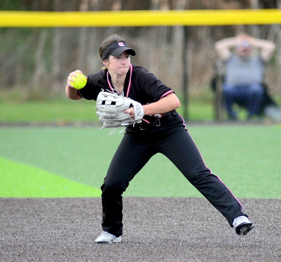 Andrew Grimm MAKING A PLAY — Big Red second baseman Sophia Zorne fires to first for an out.